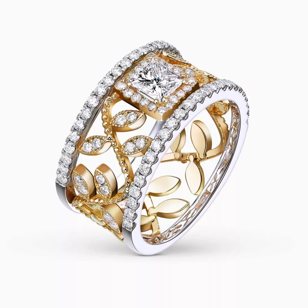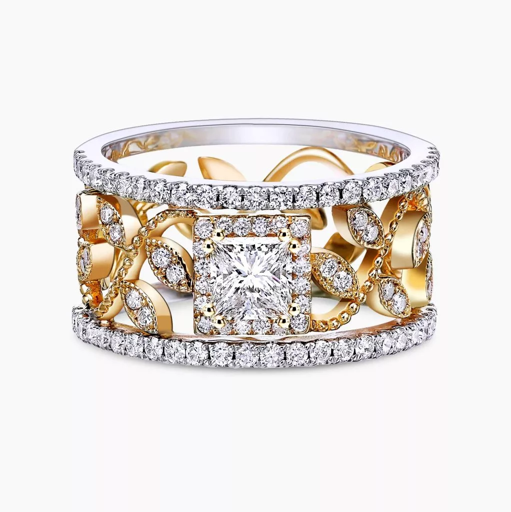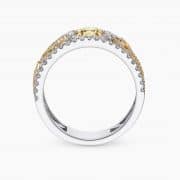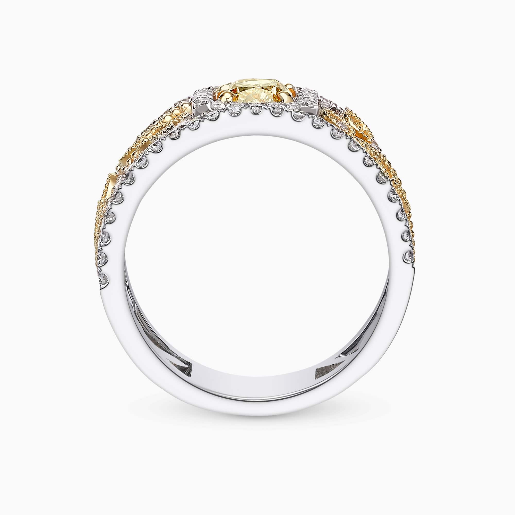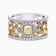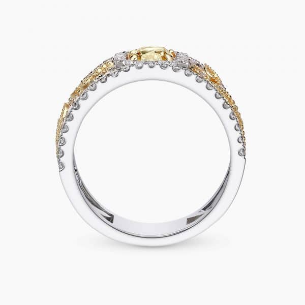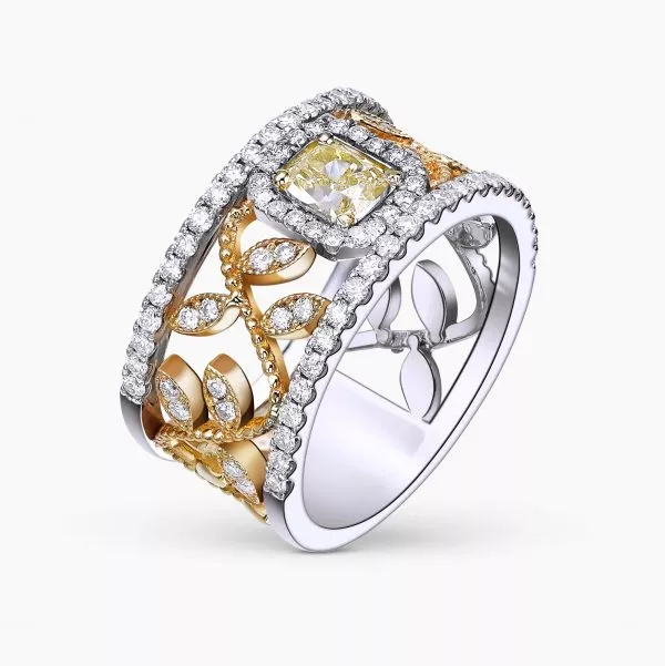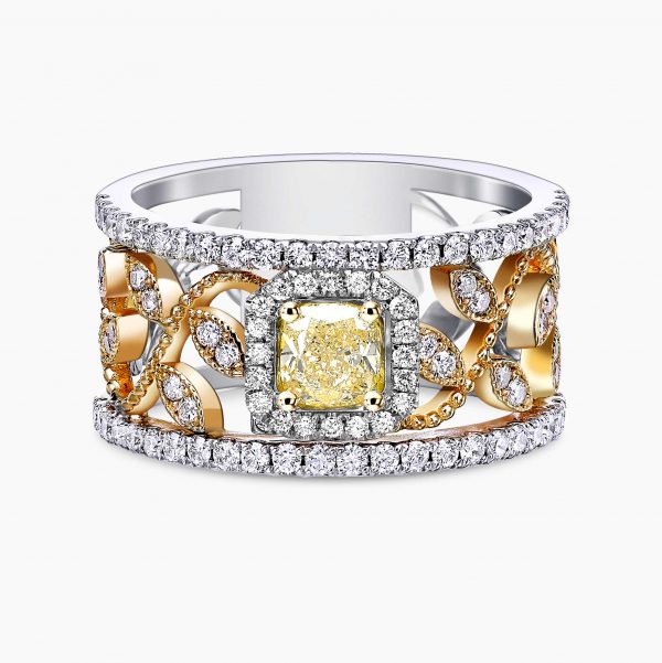 Special 14K two color Gold Open Leaf Eternity Band mounted with 0.63Ct. Fancy Light Yellow Cushion cut center Diamond.