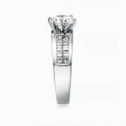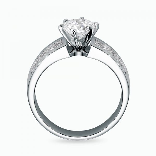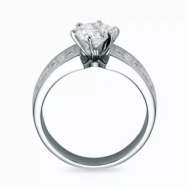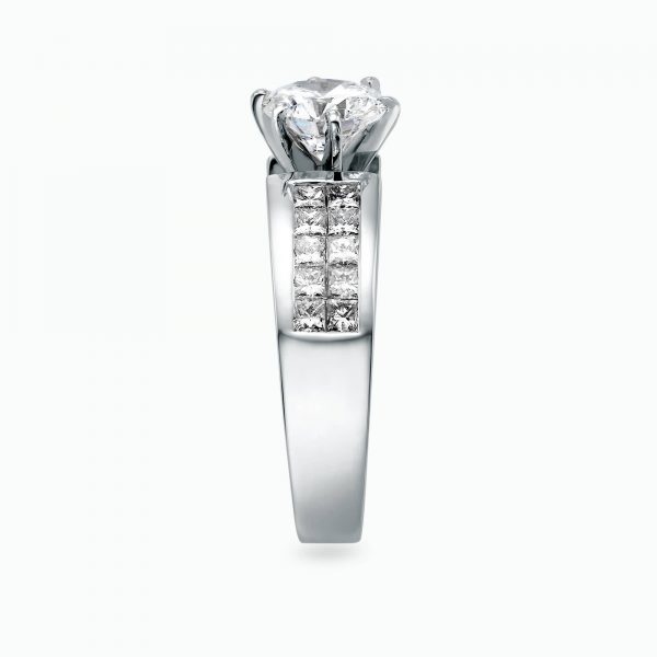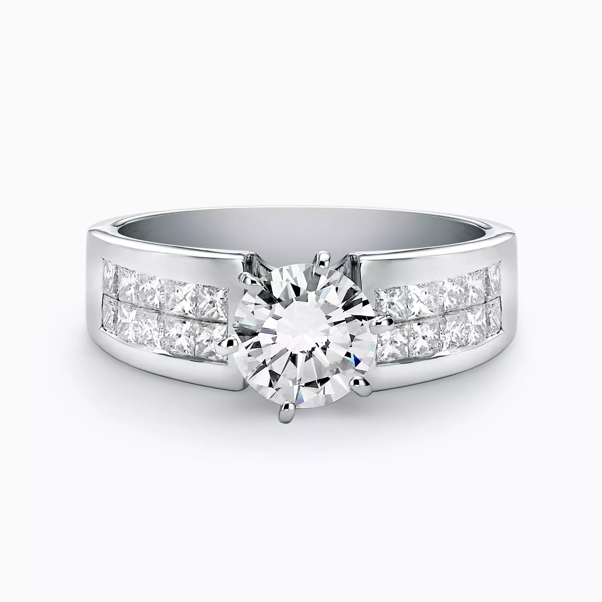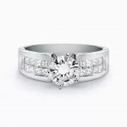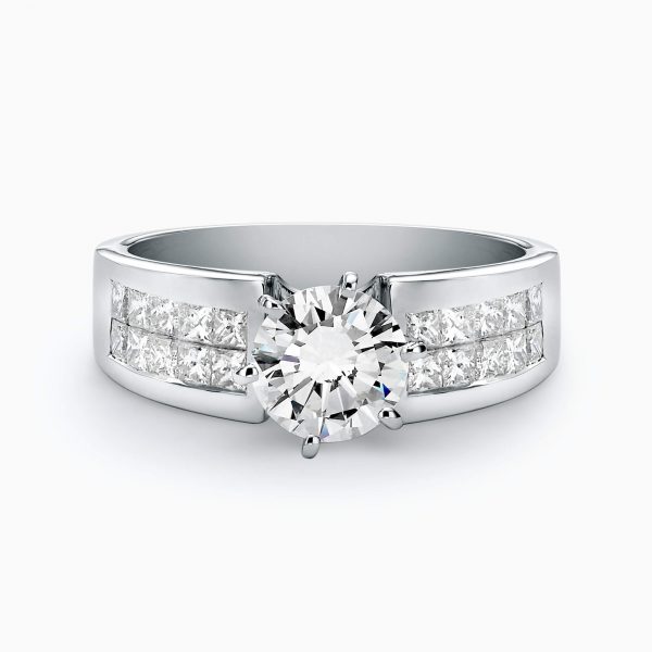 A Gorgeous Round cut center Diamond starting from 1.00Ct. with princess cut side diamonds in a double channel-set on the shank mounted in 14K Gold Ring