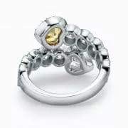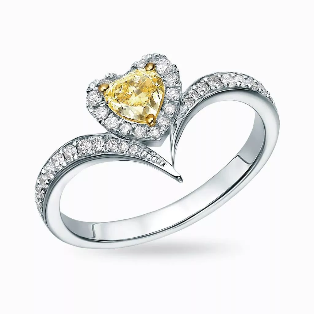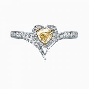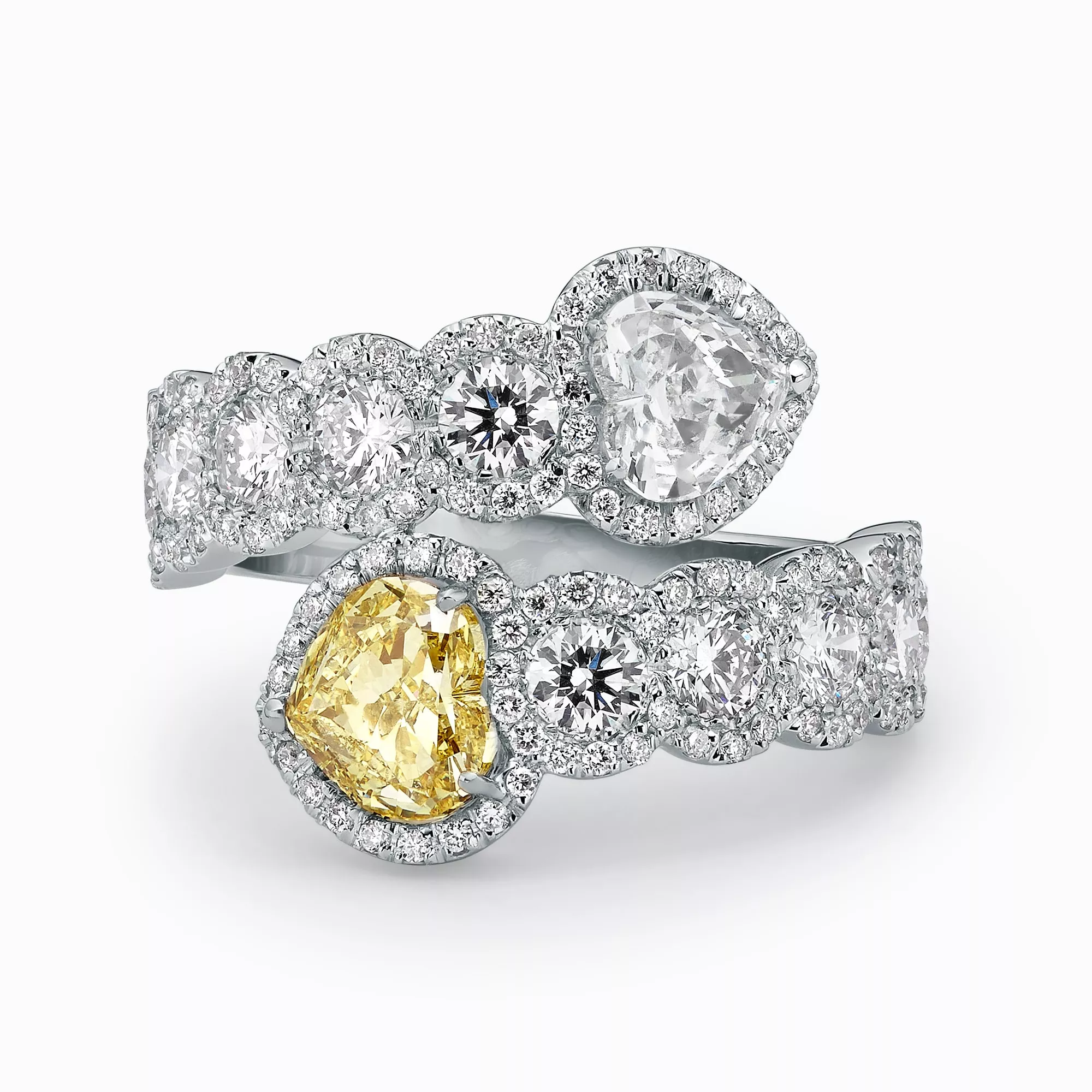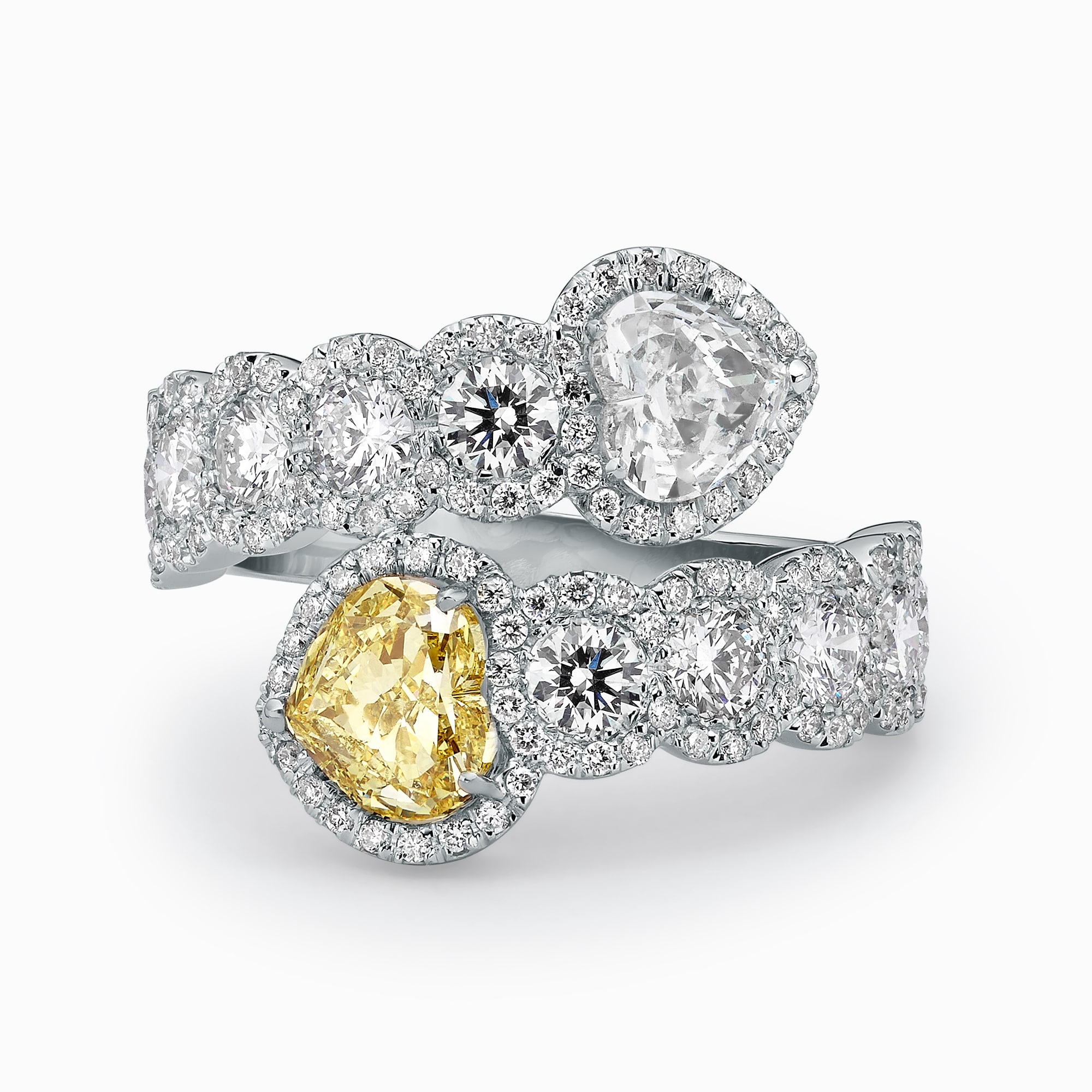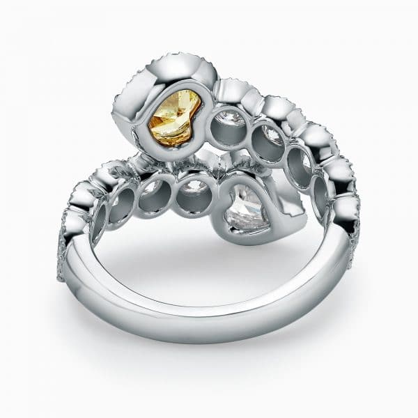 A Beautiful 14K white Gold Diamond Ring with two center Heart Shaped stones – 1.00Ct. Fancy Yellow and 0.50Ct. with 0.60Ct. Diamond Setting.