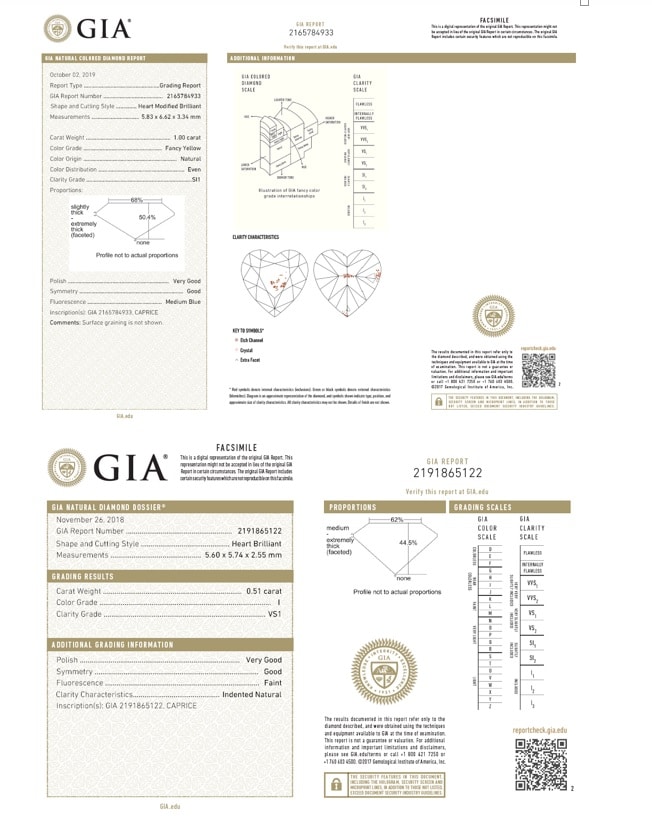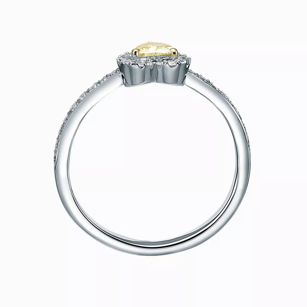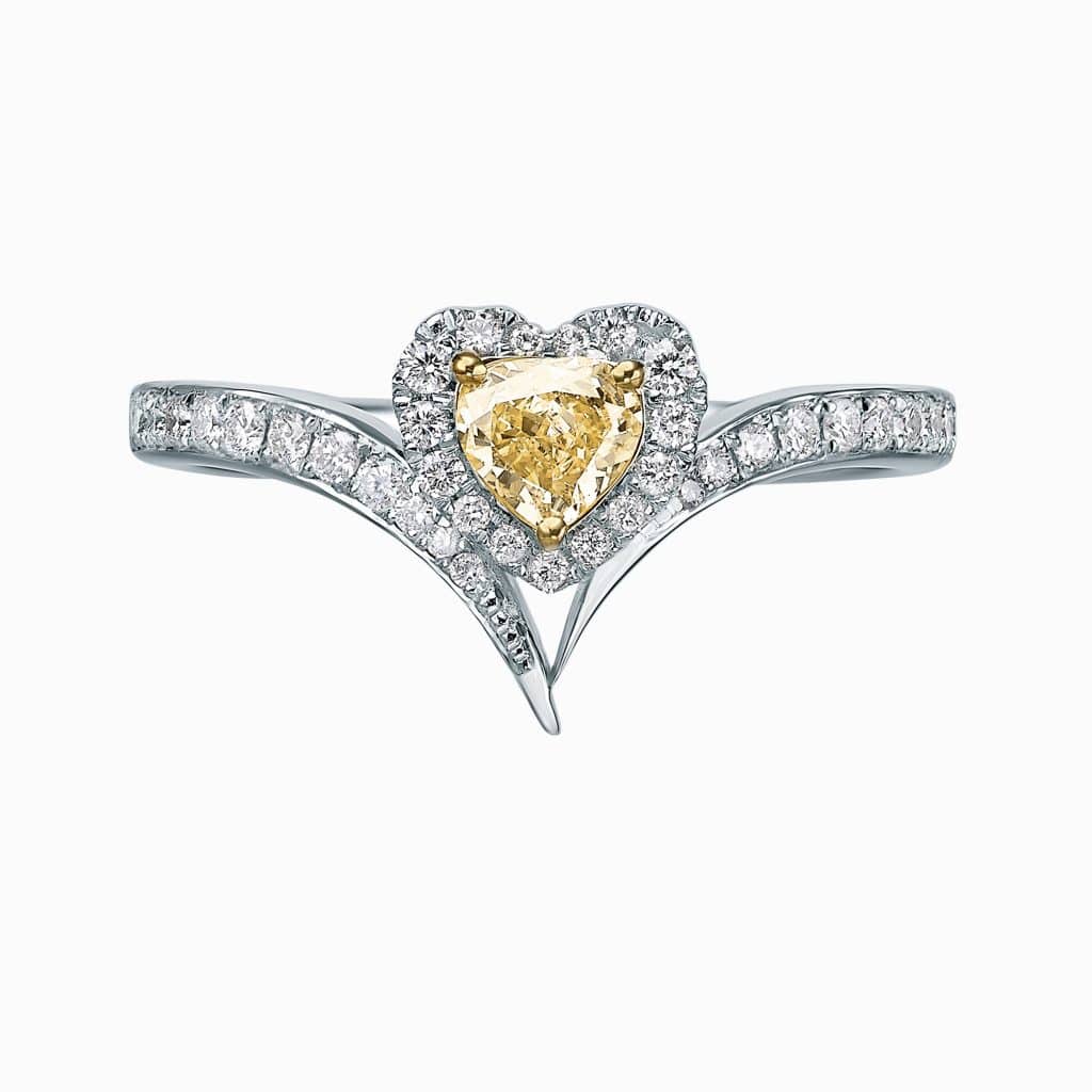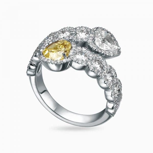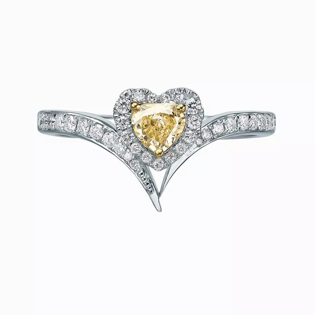 A Beautiful 14K white Gold Diamond Ring with two center Heart Shaped stones – 1.00Ct. Fancy Yellow and 0.50Ct. with 0.60Ct. Diamond Setting.