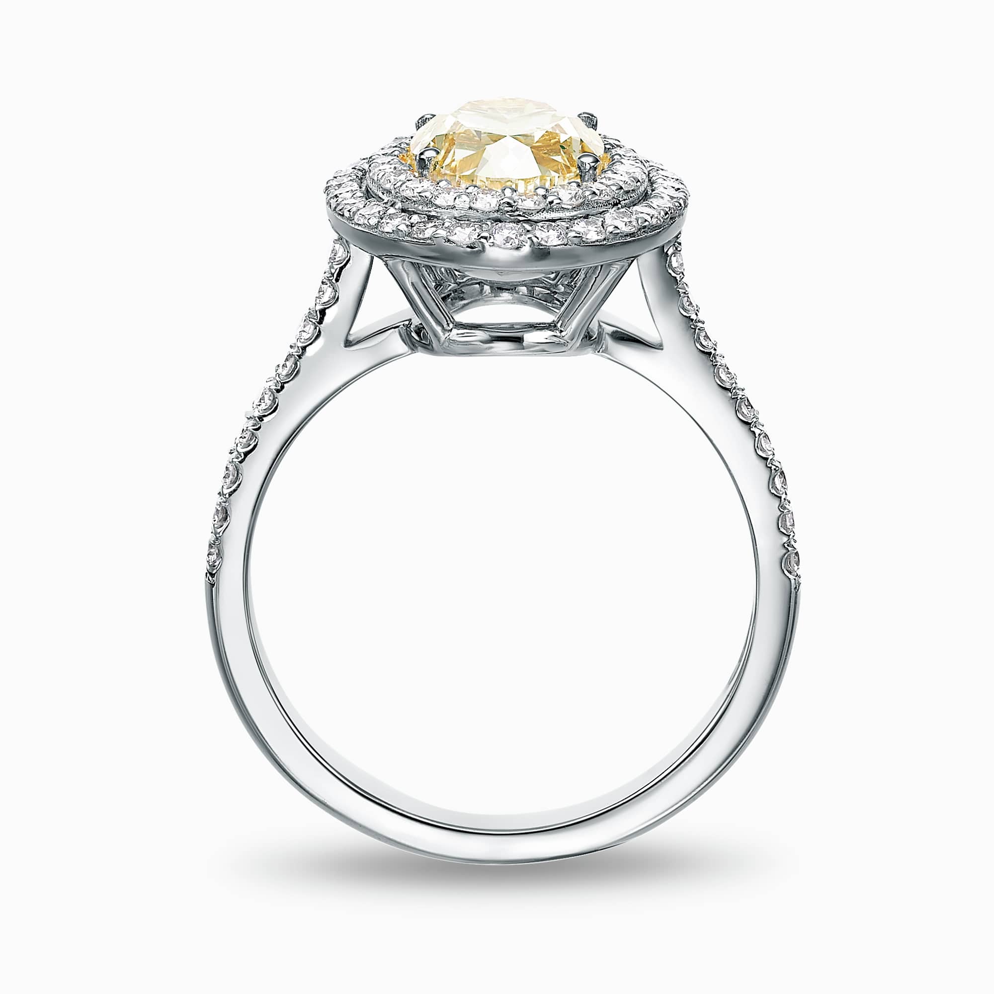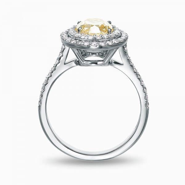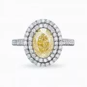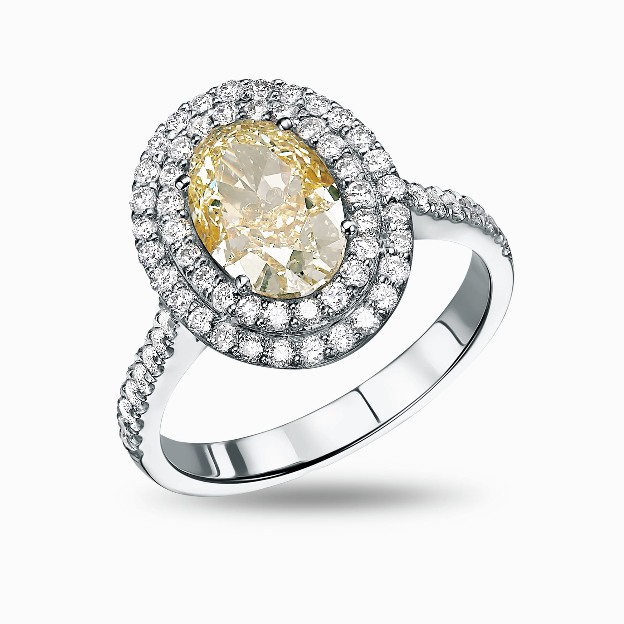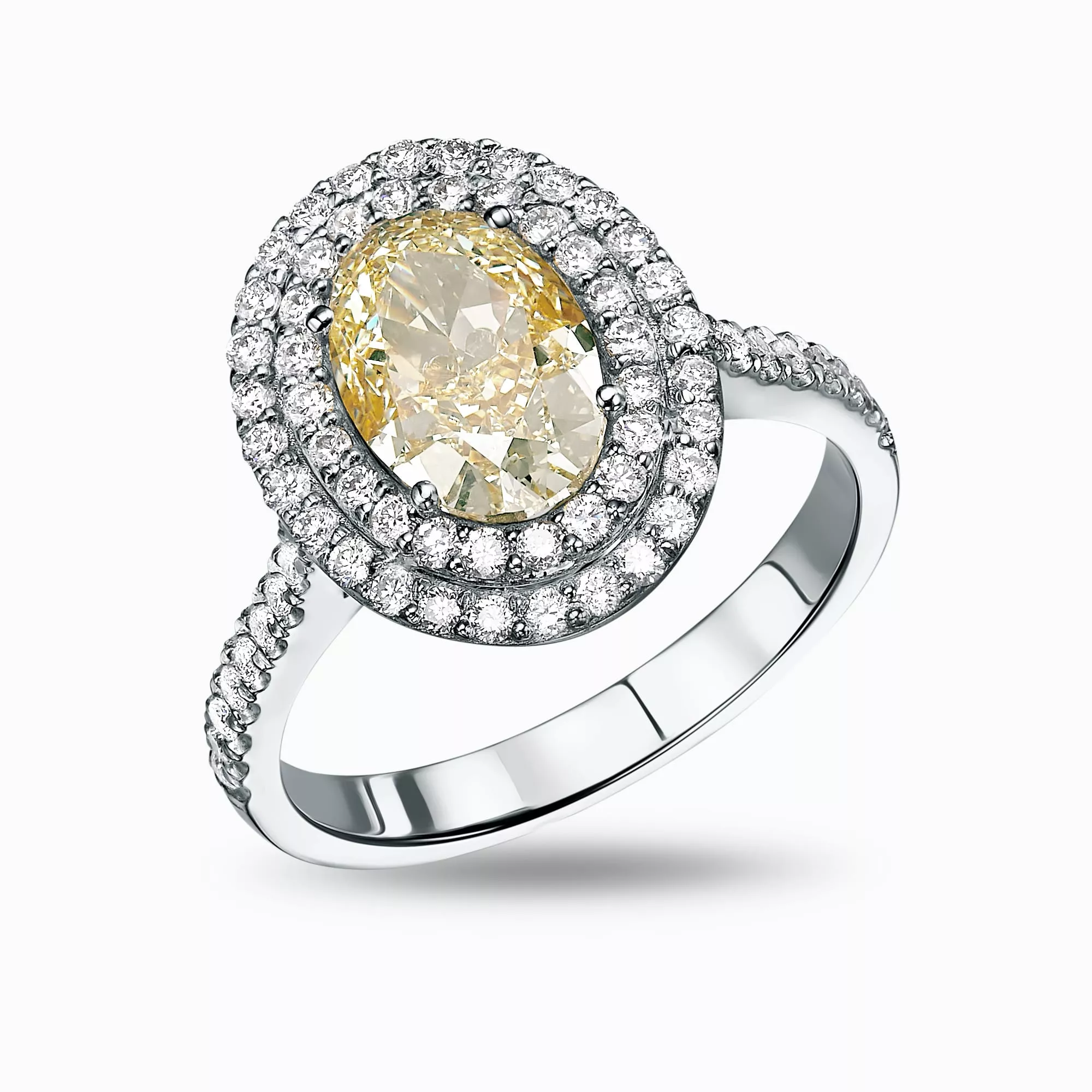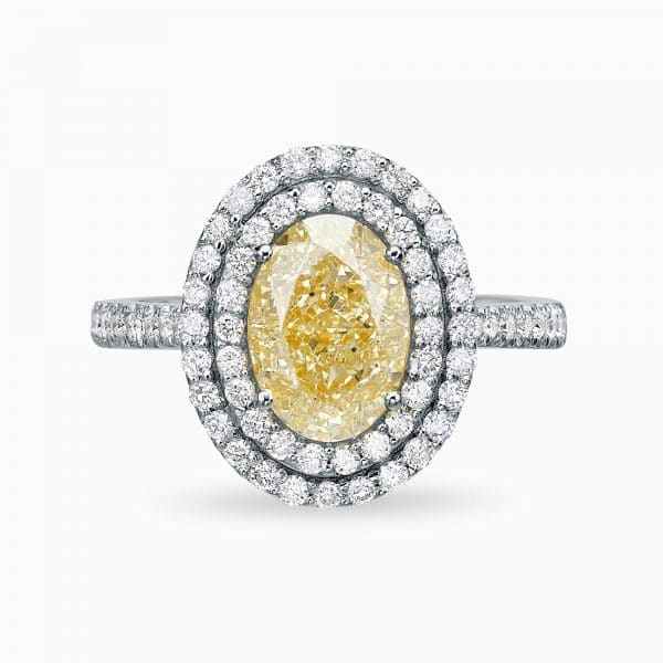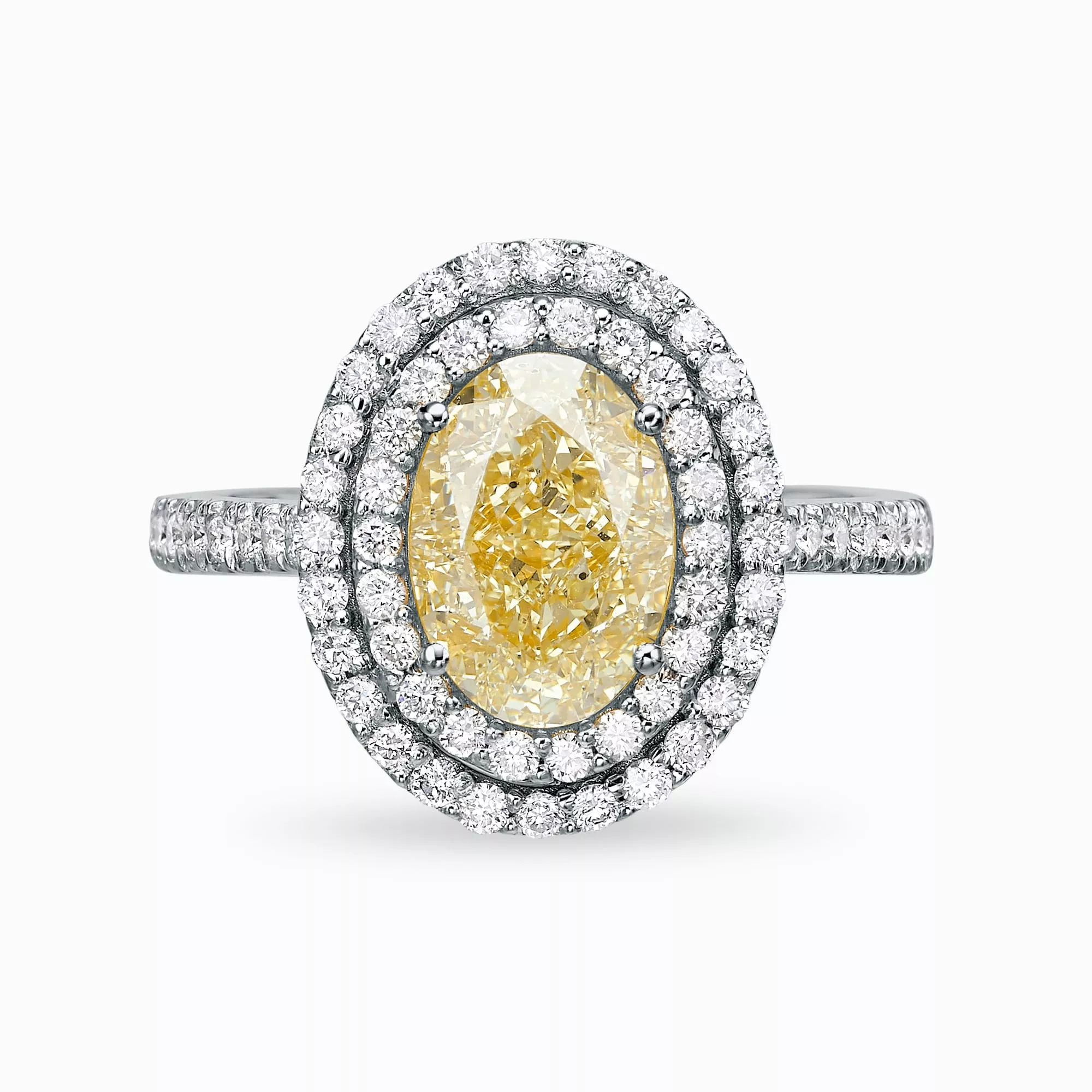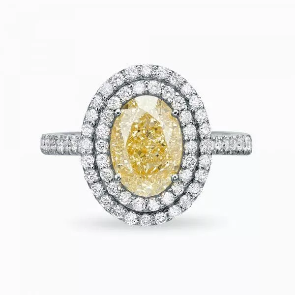 A Beautiful 2.28Ct. Fancy Light Yellow Oval cut with 0.55Ct. Double Halo Diamond set in a 14K Gold Ring.