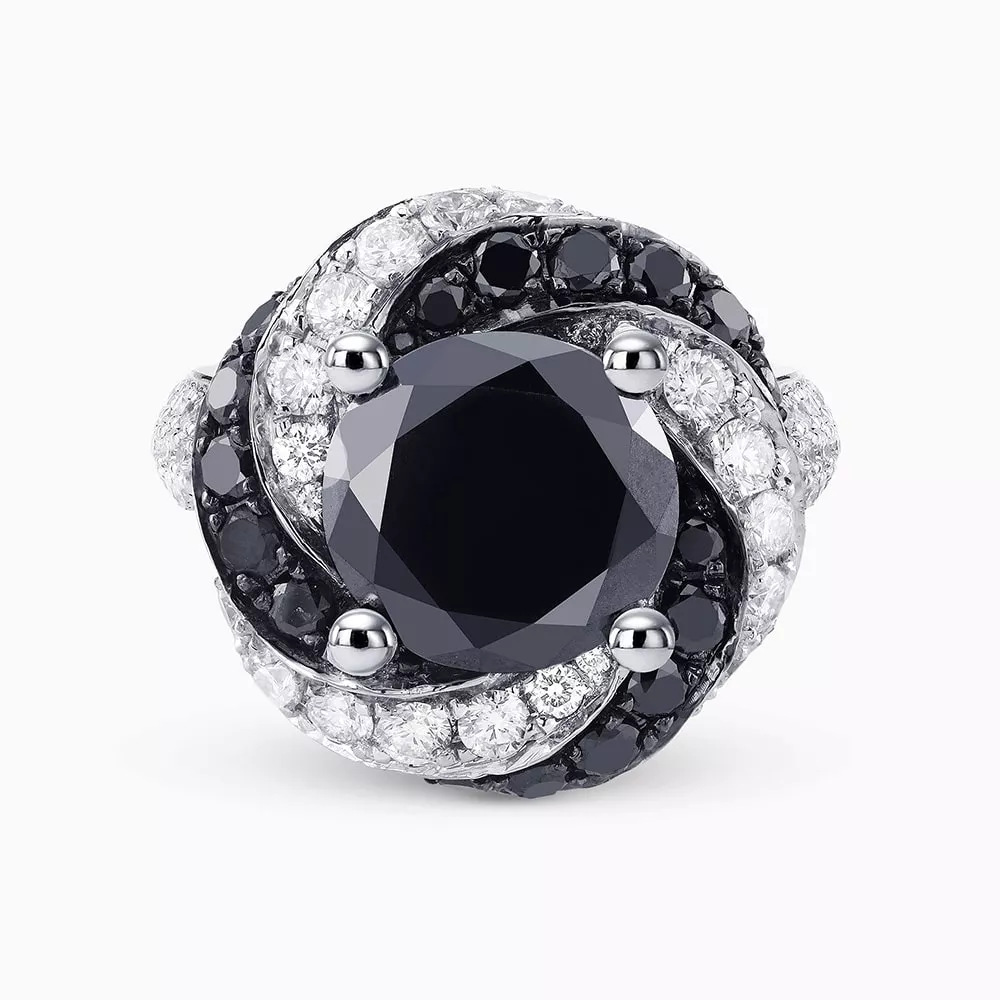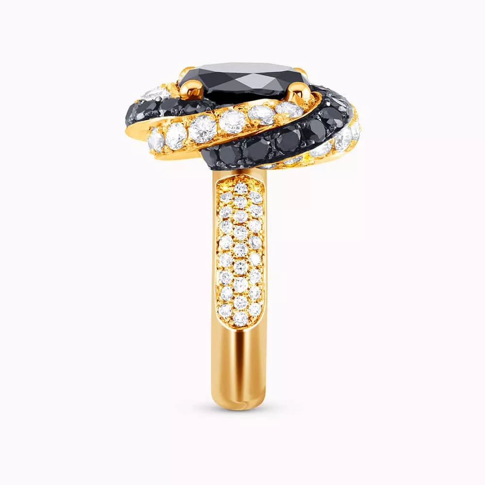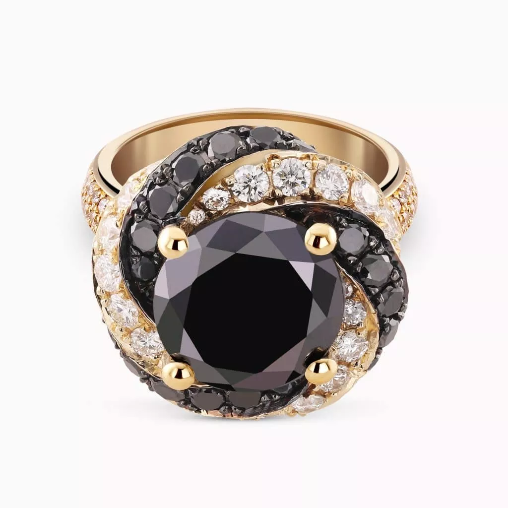 5.76Ct. Black Center Diamond set with 1.14Ct. Black Diamonds and 1.30Ct. white Diamonds in a 14K Yellow Gold Ring