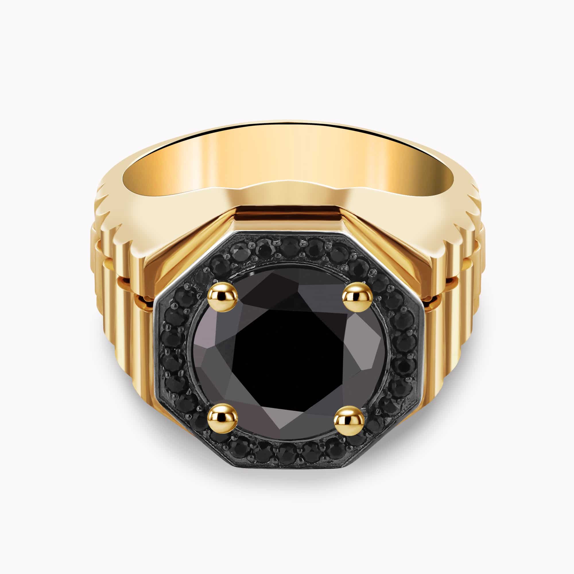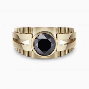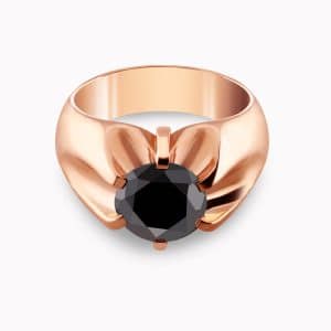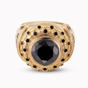 5.42Ct. Center Black Diamond set with 0.66Ct. Black Diamonds in a 14K Yellow Gold Ring.