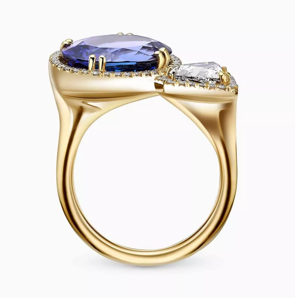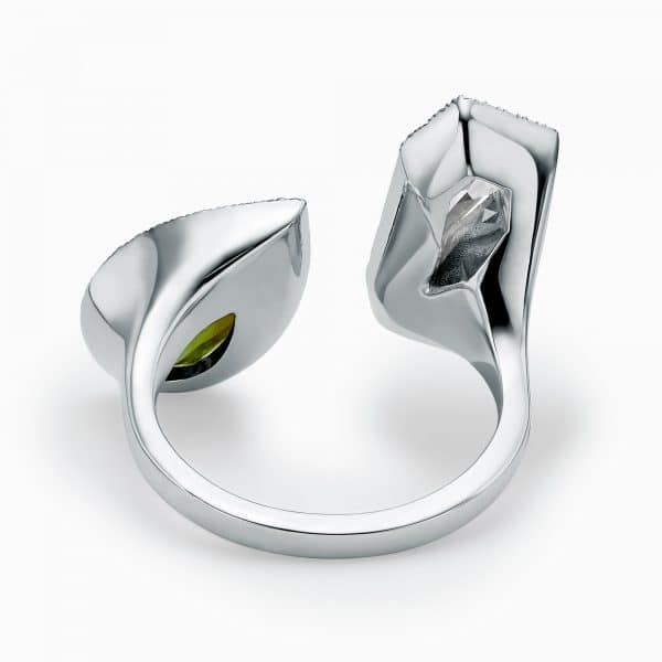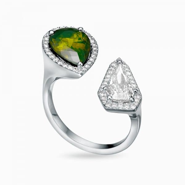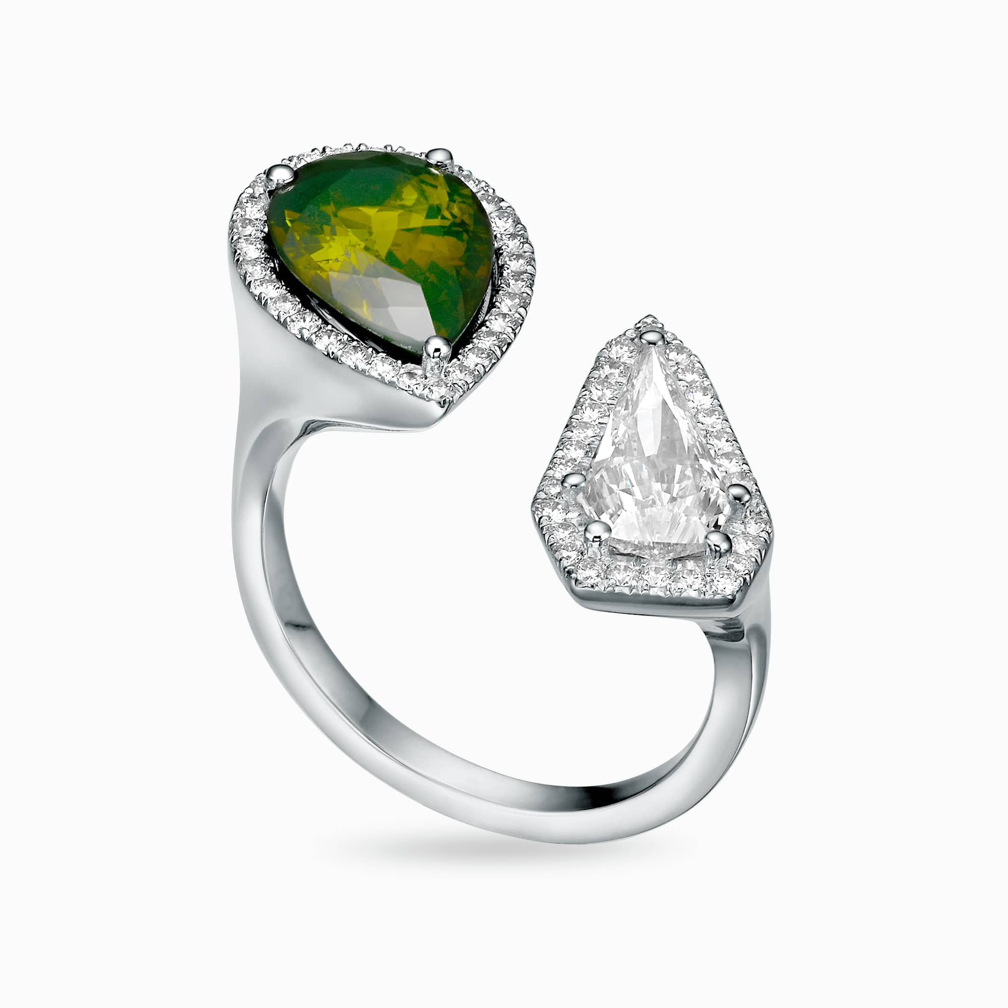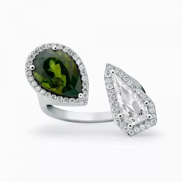 14K White Gold Bypass Halo Ring with two center stones, 0.75Ct. Shield cut Diamond and 2.83Ct. Pear Sheped Tourmaline Gemstone.