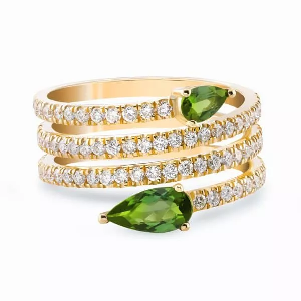 0.60Ct Tourmaline gemstones with 0.84Ct. Diamond setting in 14K Yellow Gold Spiral shaped Ring.