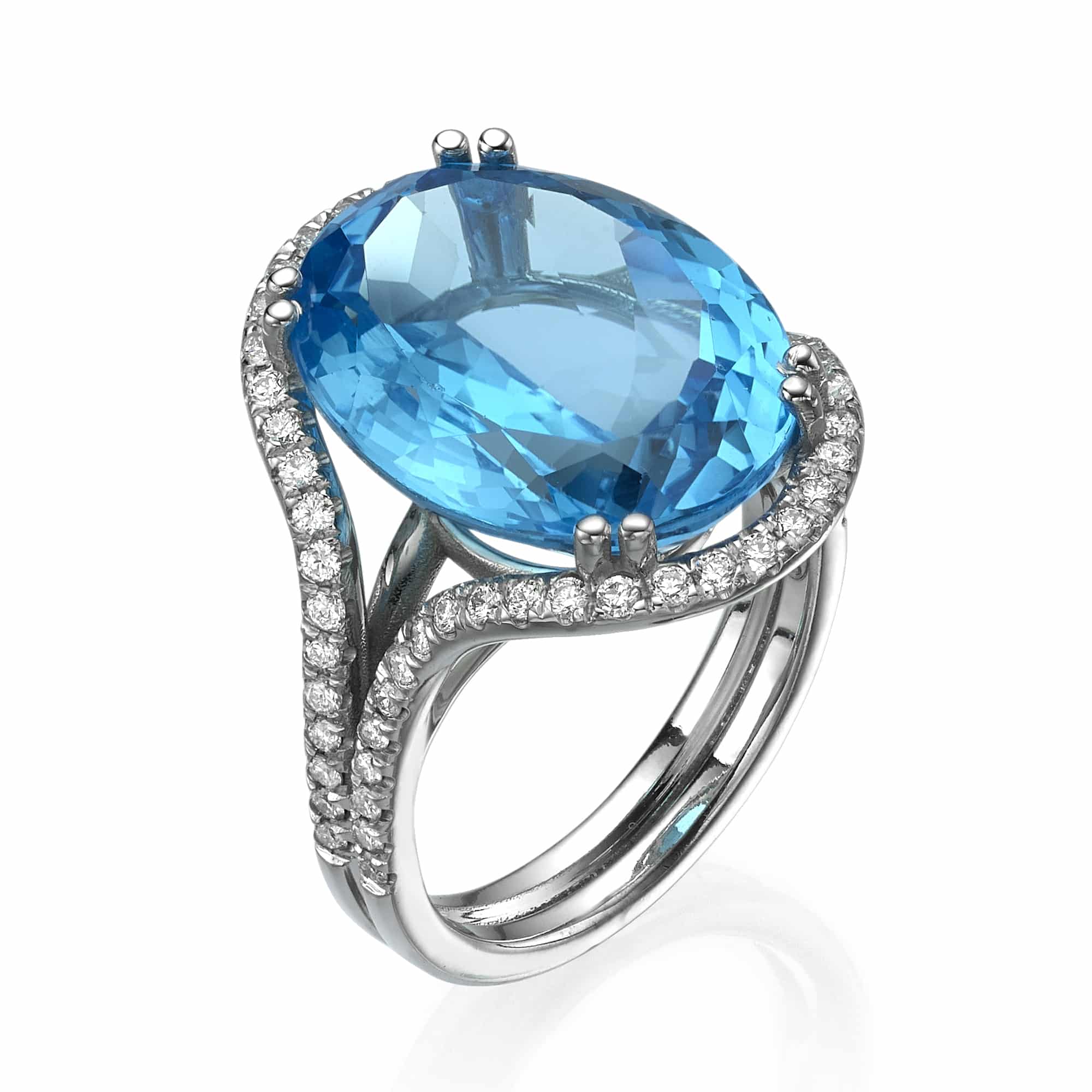 14.00Ct. Blue Topaz center Stone with 0.68Ct. Diamond Halo in a 14K Gold Ring.