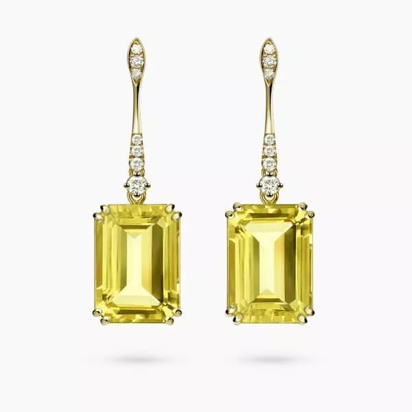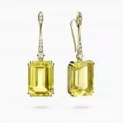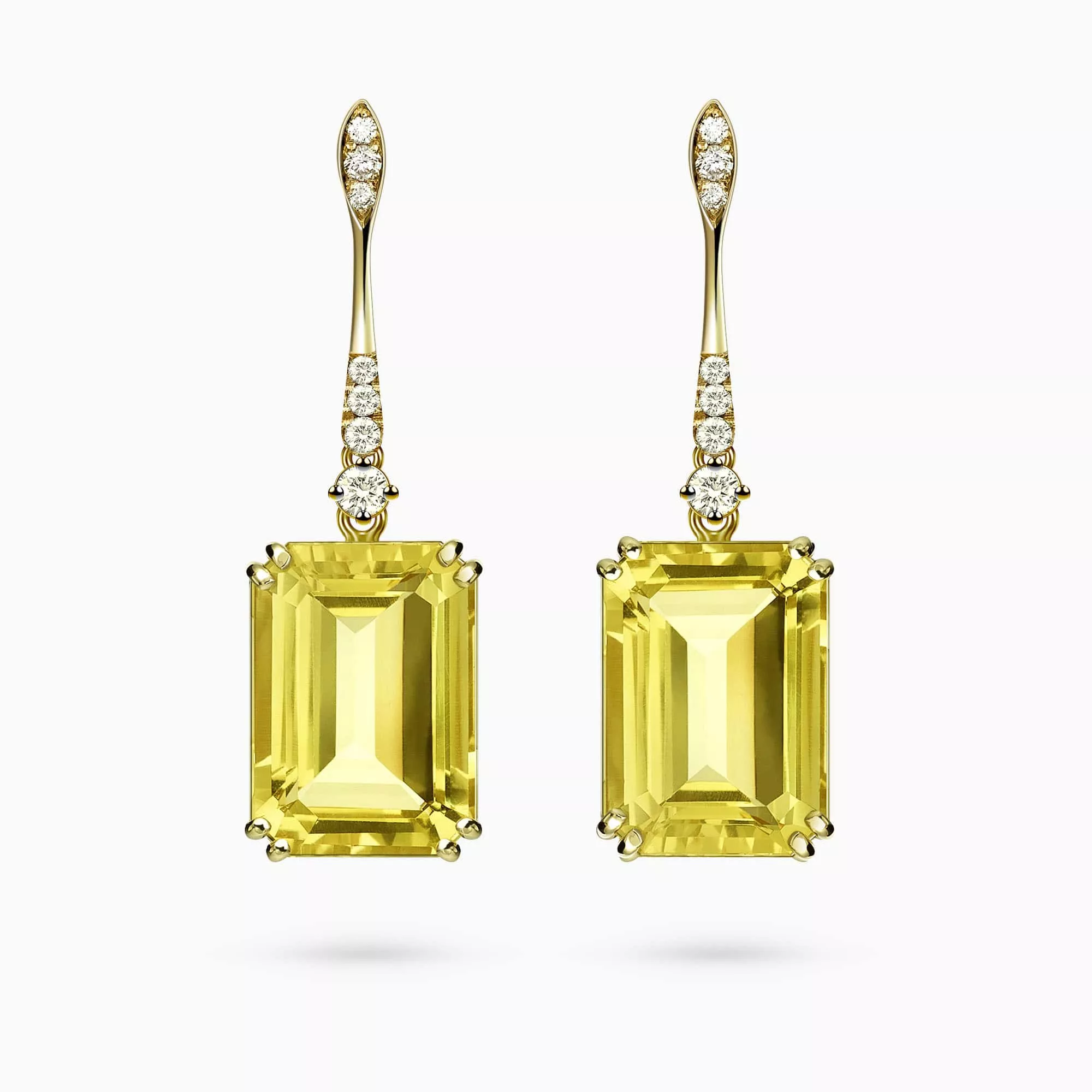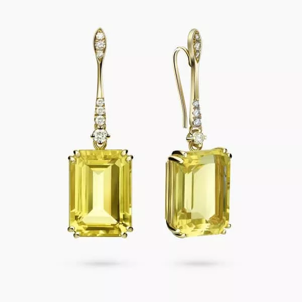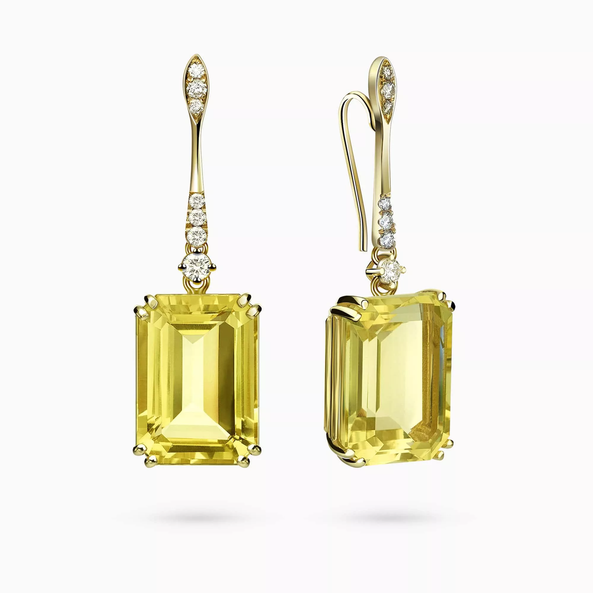 14K Yellow Gold Earrings, set with 31.50Ct. Lemon Quartz Stones and 0.36Ct. Diamond setting.