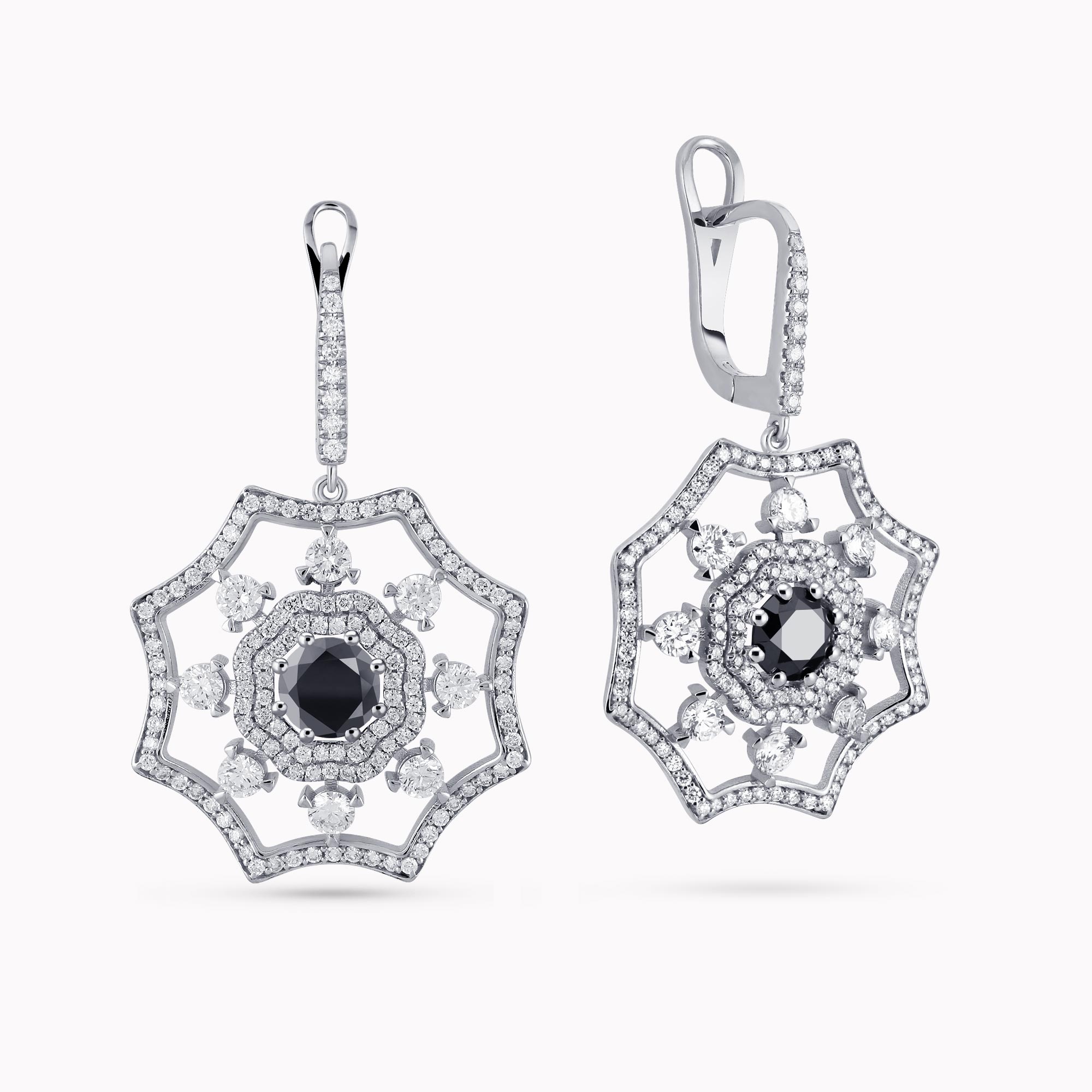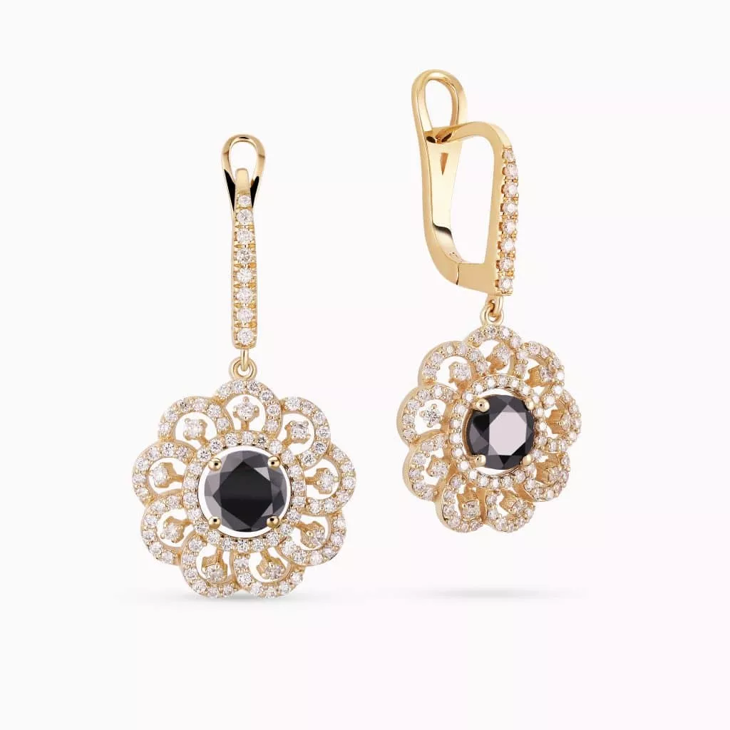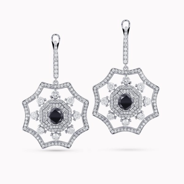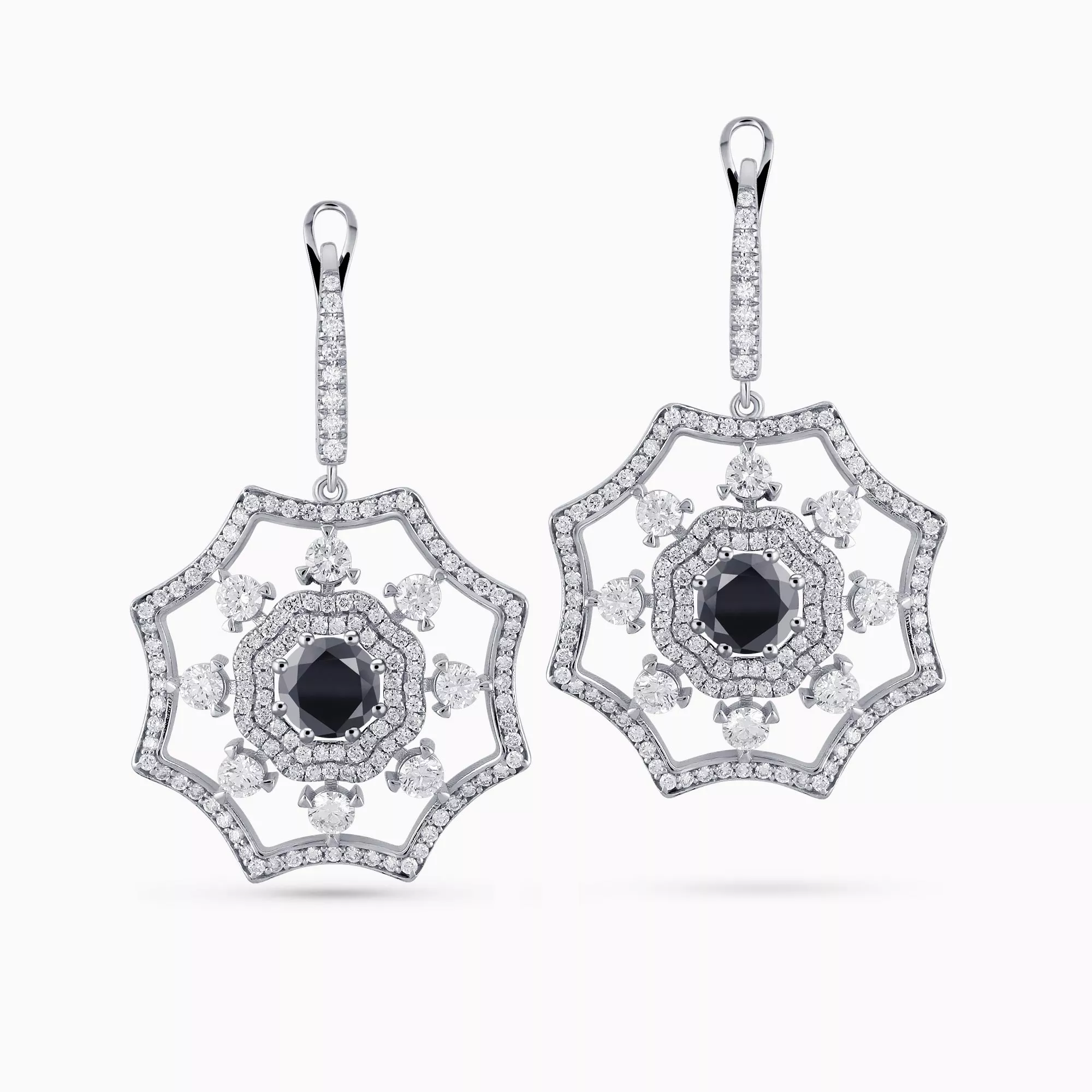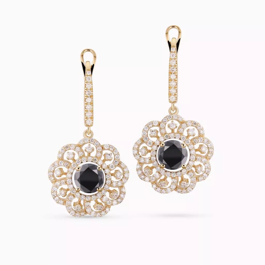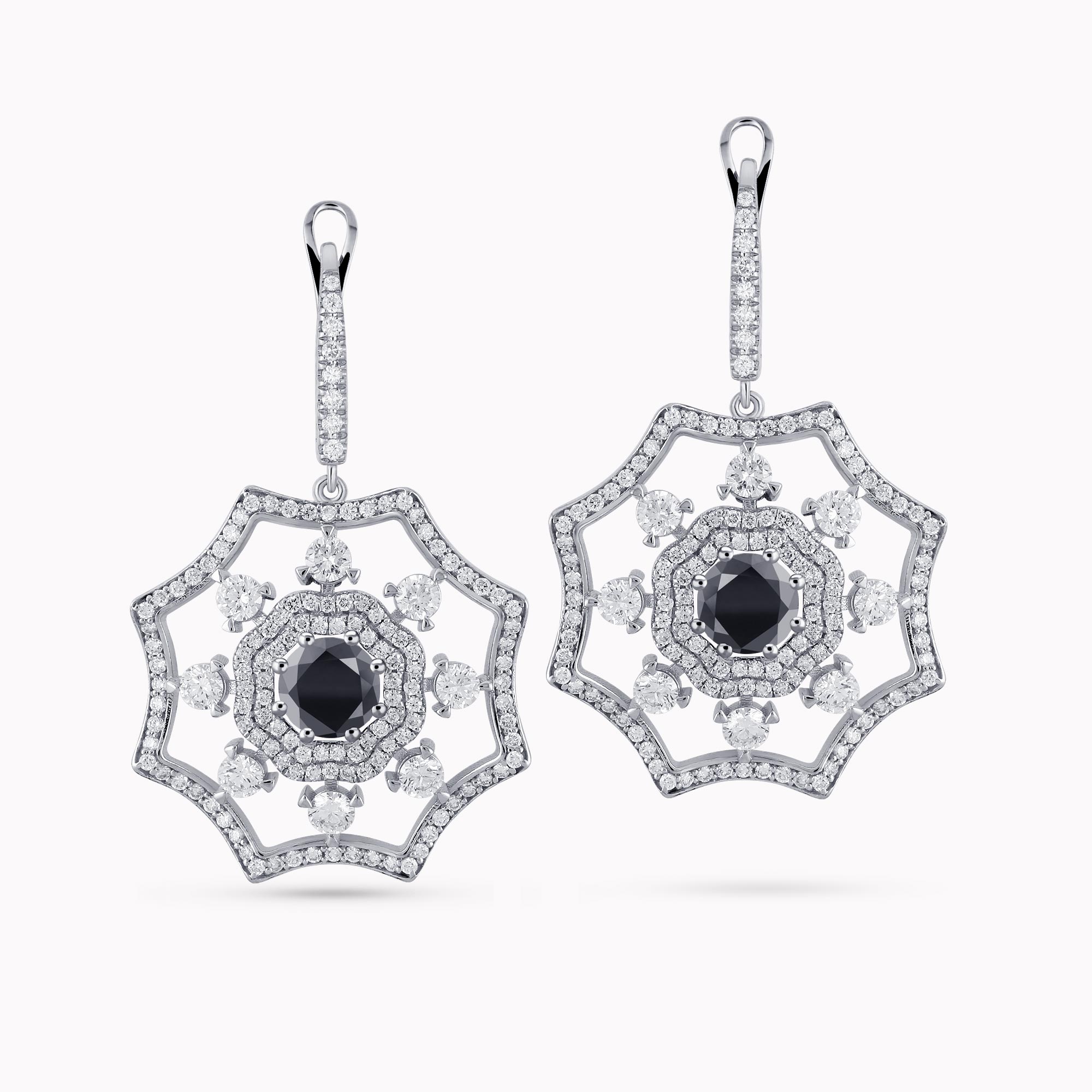 14K White Gold Flower shaped Earrings with 1.30Ct. Center Black Diamonds and 2.38Ct Diamond Setting.