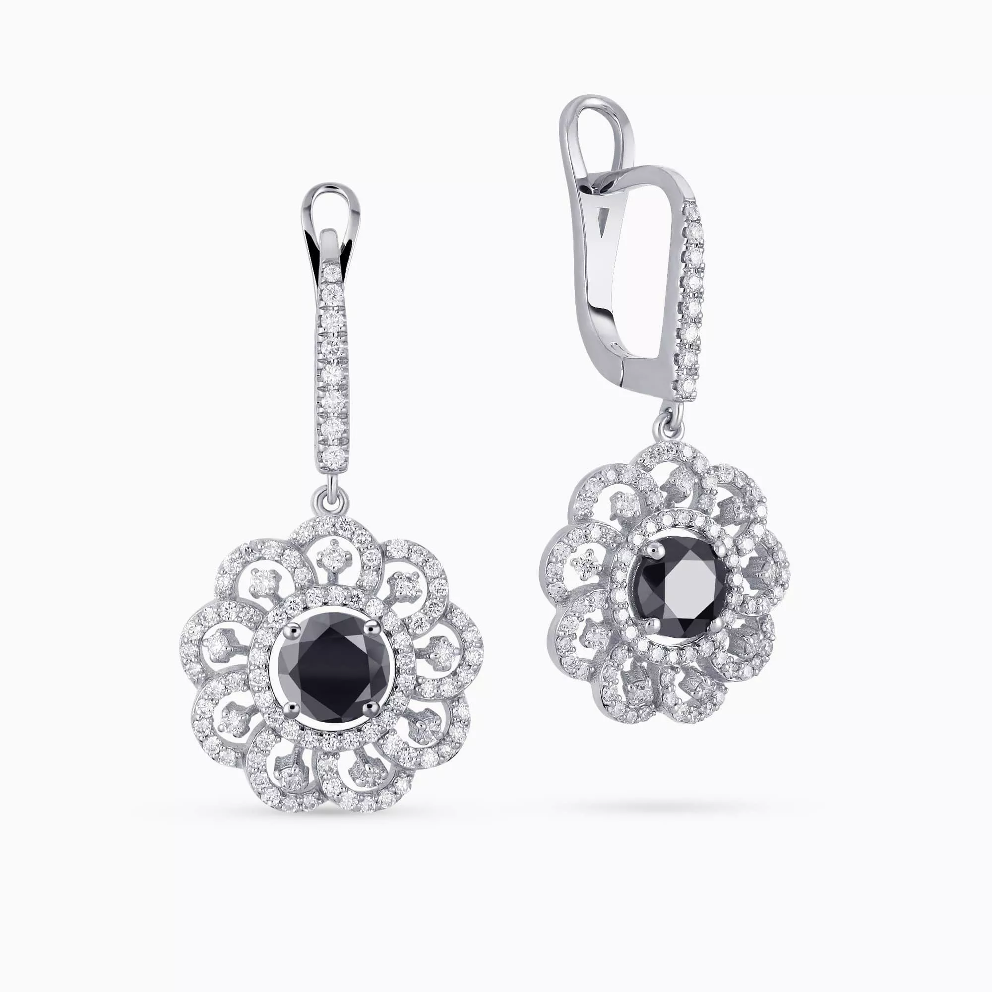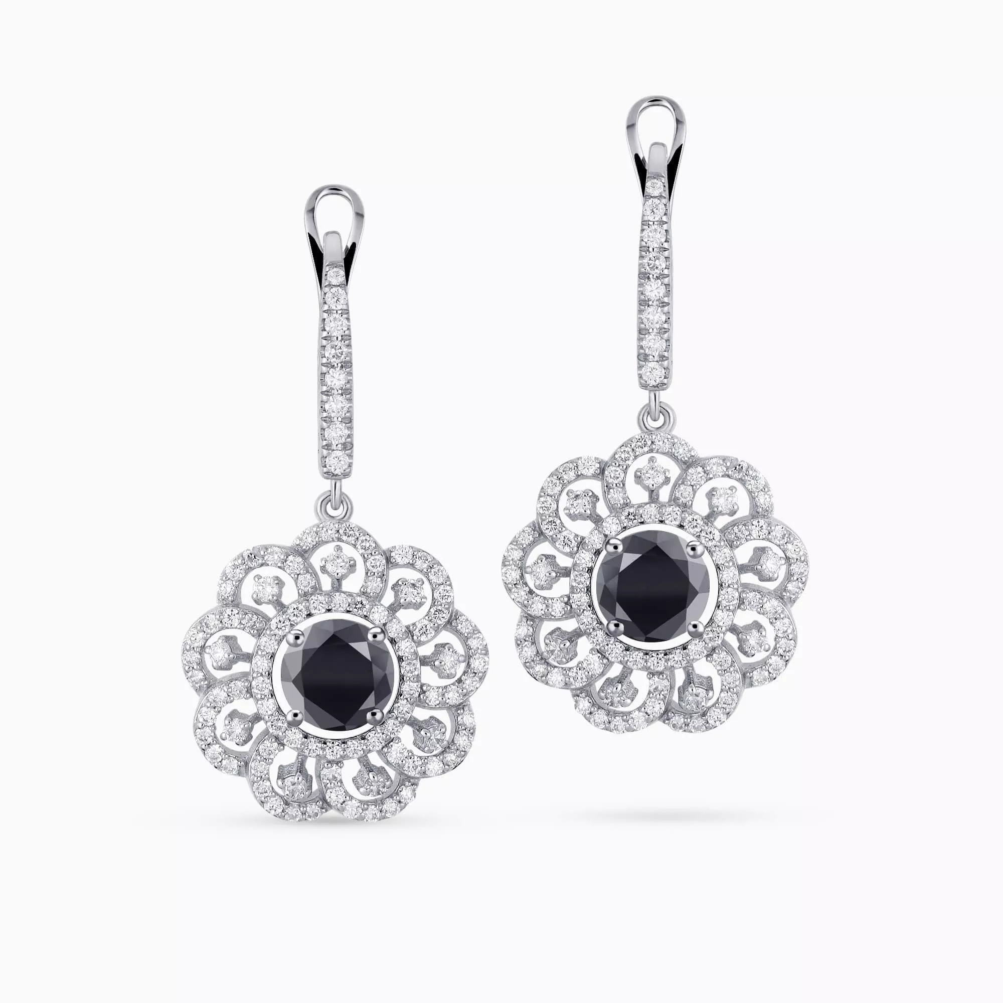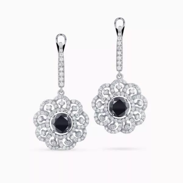 14K White Gold Flower shaped Earrings with 1.30Ct. Center Black Diamonds and 1.03Ct Diamond Setting.