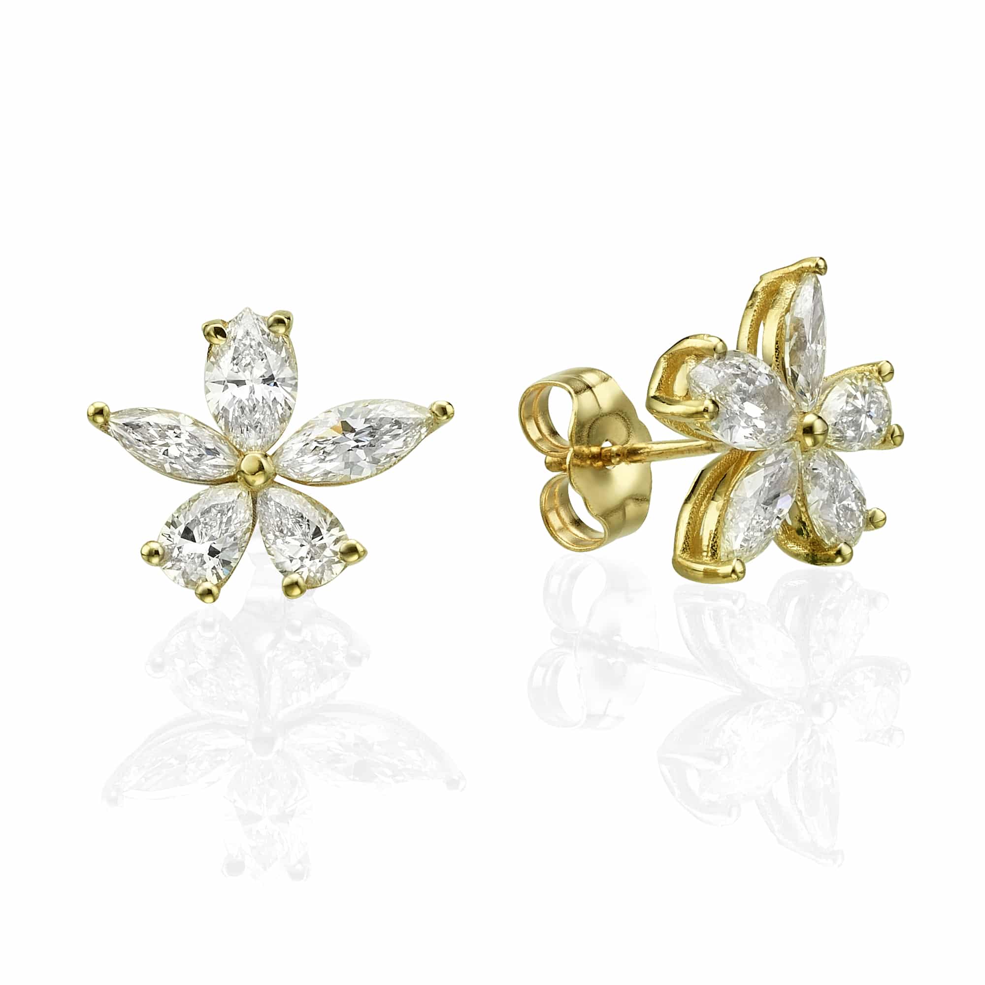 14K gold Earrings, each earring is set with 3 pear shape diamonds and 2 marquise cut diamonds, with a total weight of 1.34 carats.