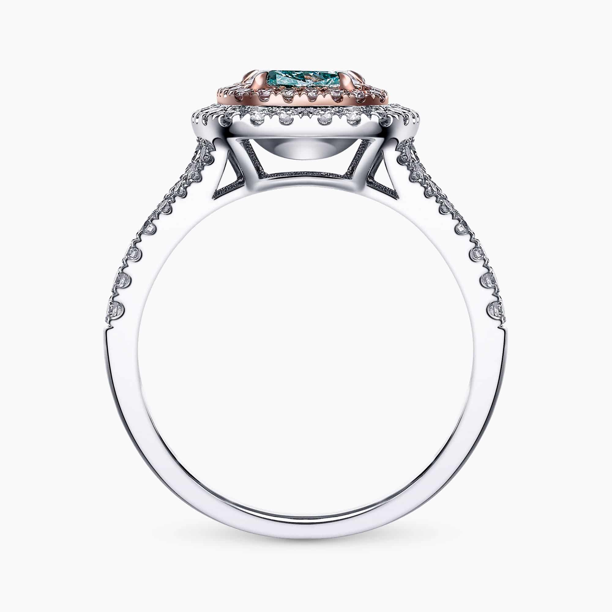 A Beautiful 1.00Ct. Fancy Light Green Cushion cut with 1.23Ct. Double Halo Diamond set in a 14K Gold Ring.
