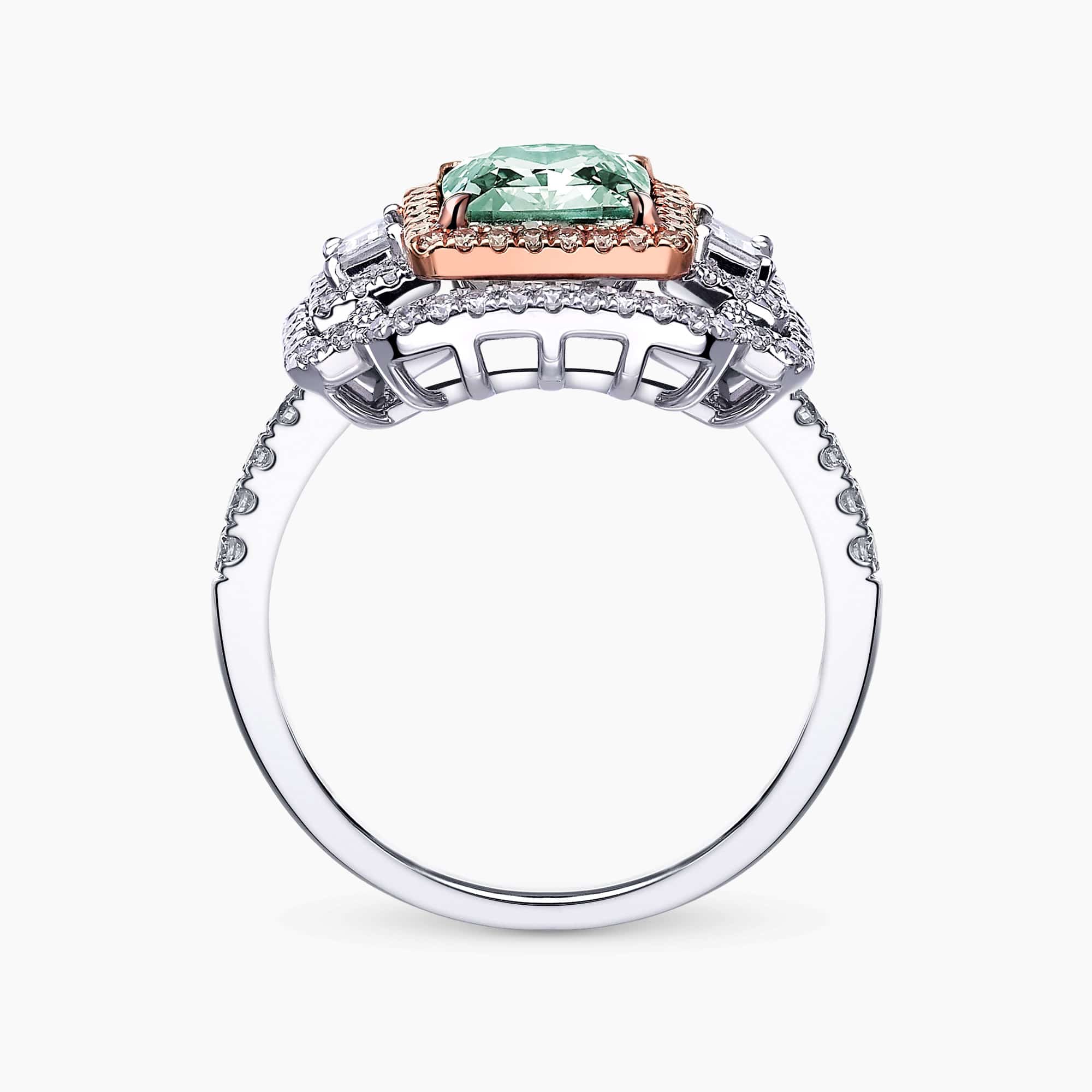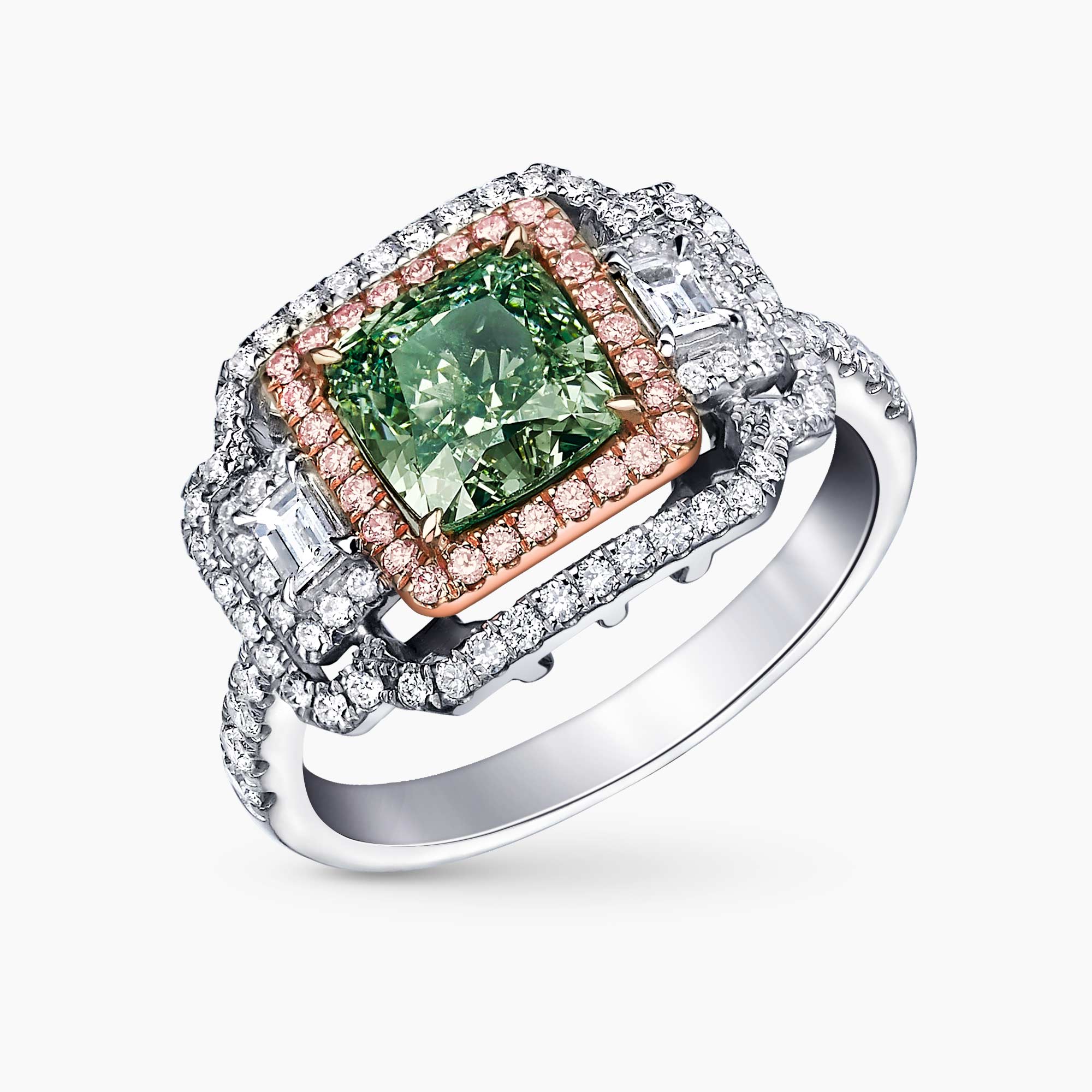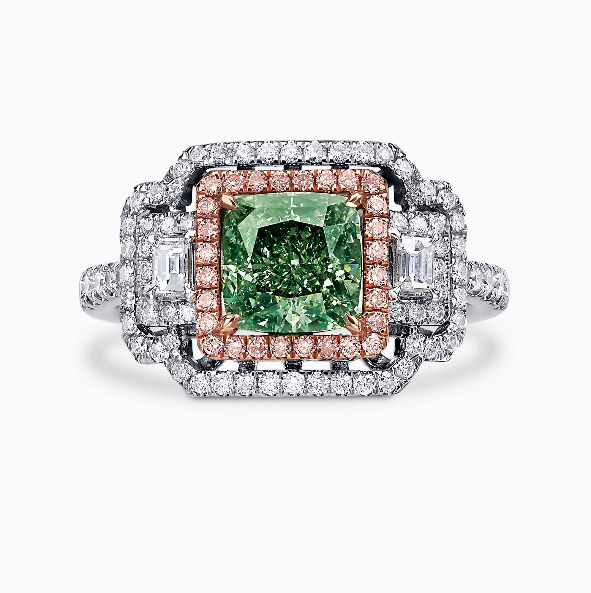 A Beautiful 1.00Ct. Fancy Light Green Cushion cut with 1.64Ct. Double Halo Diamond set in a 14K Gold Ring.