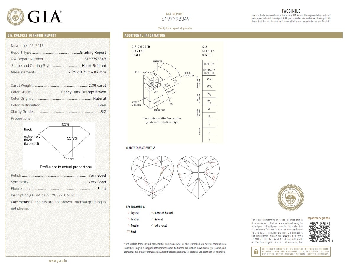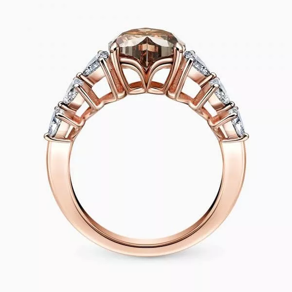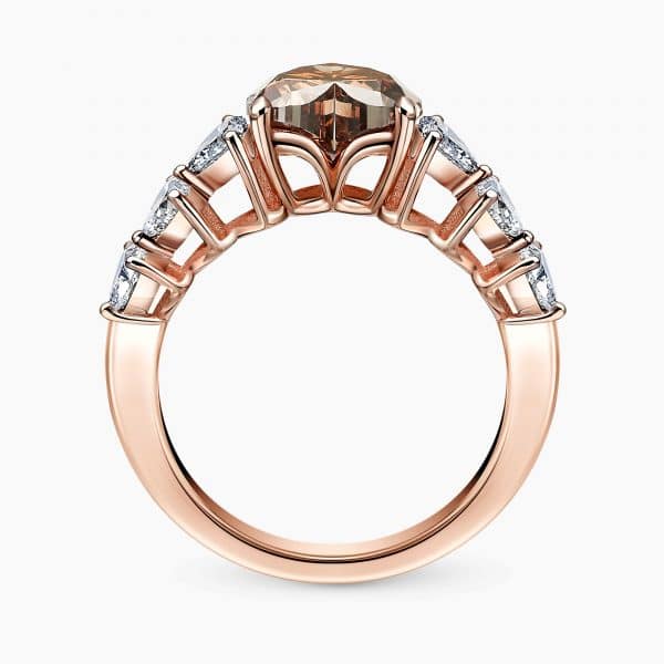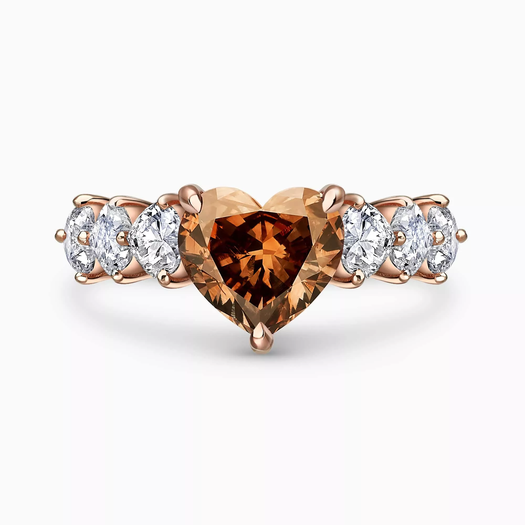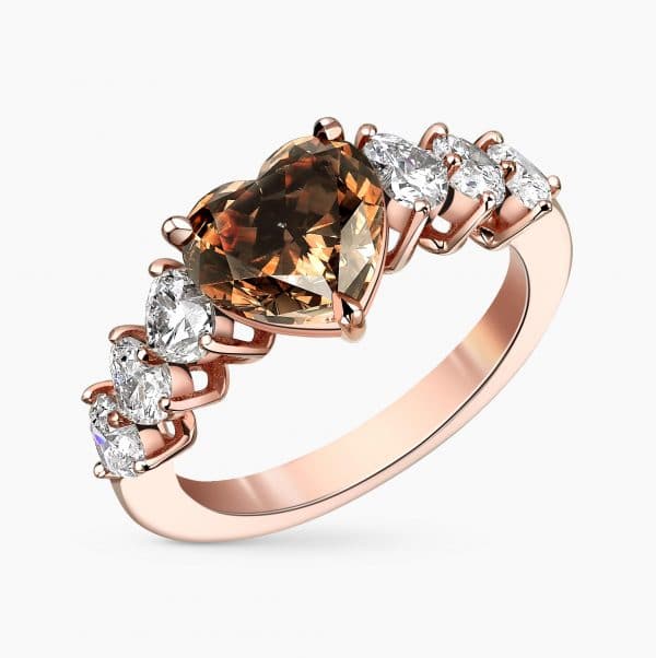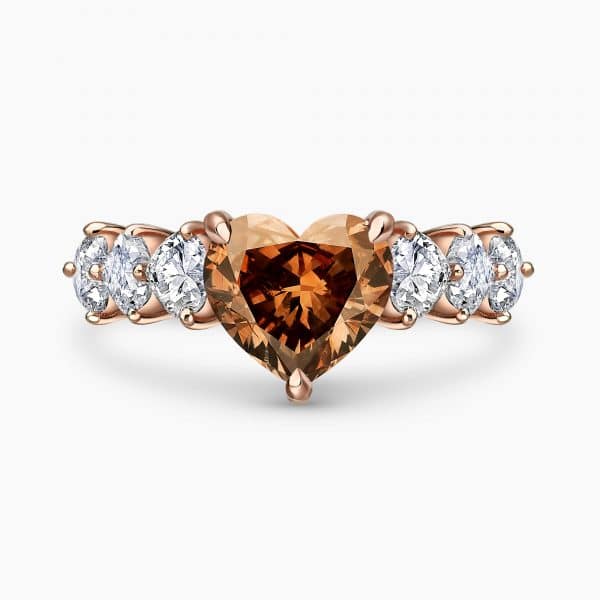 A Beautiful 2.30Ct. Fancy Dark Brown Heart shaped center Diamond and 1.25Ct. Heart shaped Diamonds setting on the shank, mounted in a 14k Rose Gold Ring.