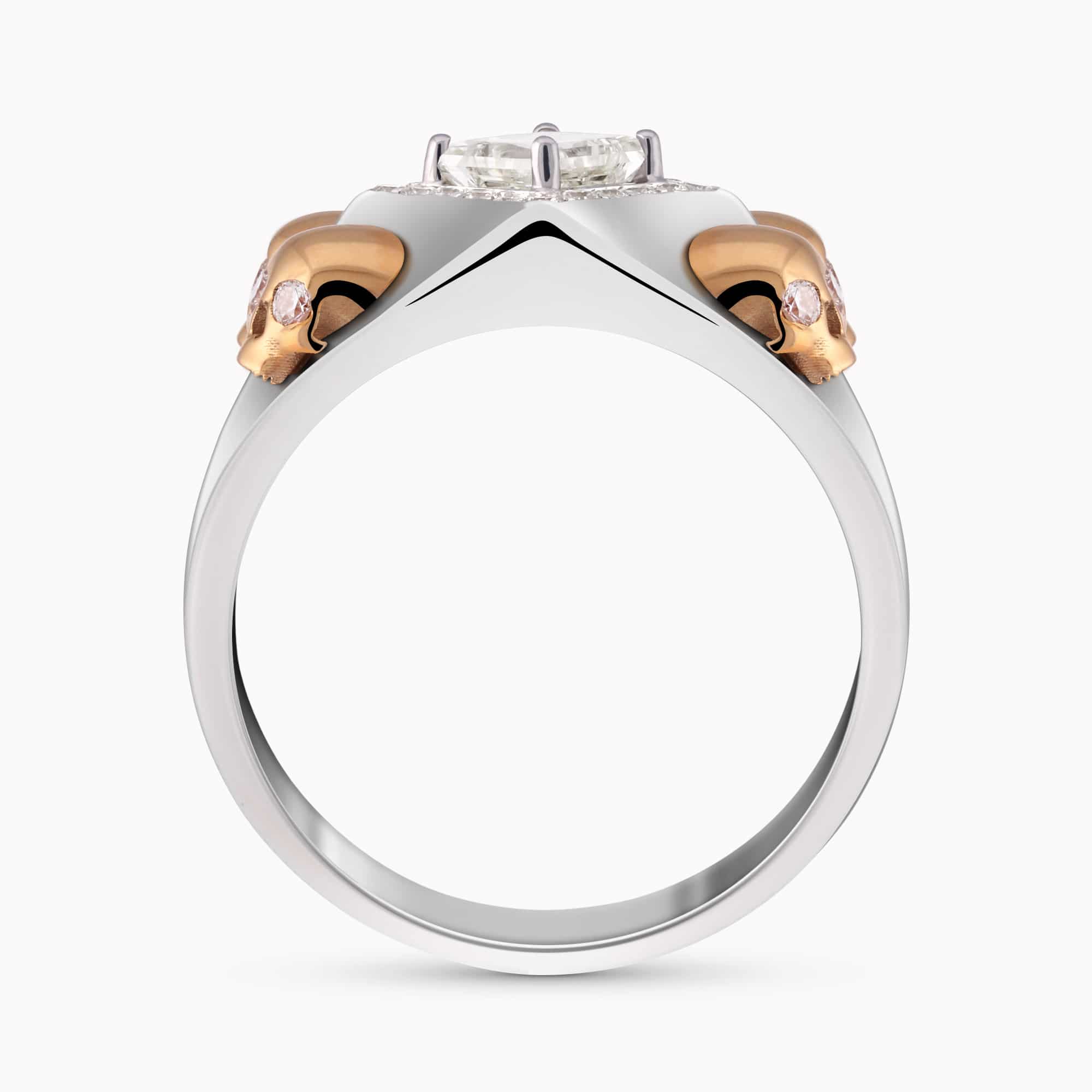 18K White and Rose Gold Skull Ring set with a 0.74Ct. Princess Cut Center Diamond and 0.32Ct. Diamonds.