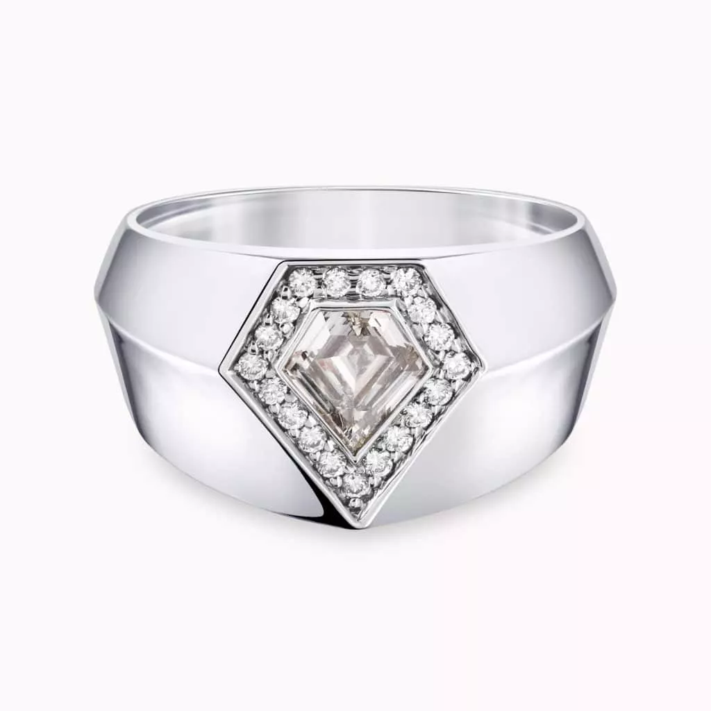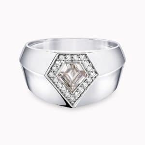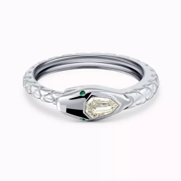 18K White Gold Snake Ring set with a 0.32Ct. M VS2 Shield Cut Center Diamond and 0.02Ct. Emerald stone.